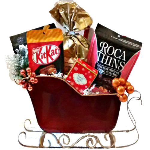 This stunning burgundy metal sleigh comes loaded with delicious Roca Thins, KitKat, Snowman Marshmallows, Holiday Tea, Butter Toffee Pretzels, Peppermint Wafer Rolls, Chocolate Plus Raspberry Wafers, Hawaiian Host Chocolate Macadamia Nuts finished with festive bronze glass ornaments and hand-tied bow.